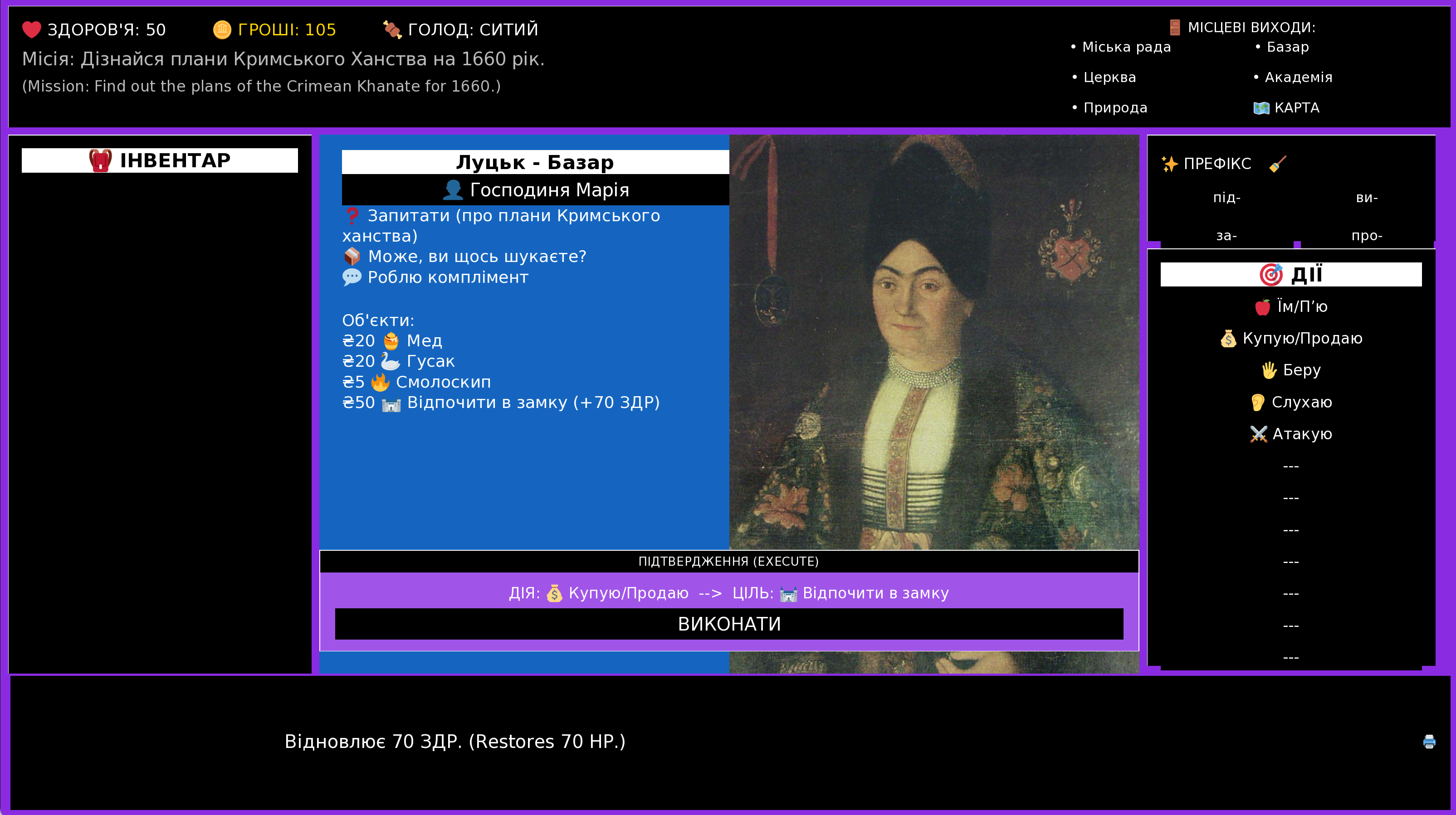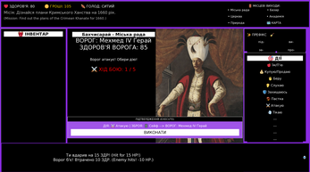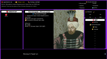 This is a bilingual game in Ukrainian and English about the people and events of 1659. Travel through Crimea and Hetmanate to complete a political mission, or to make a fortune as a merchant or a pirate. You can also win as a scholar by collecting books and using verbs from them.